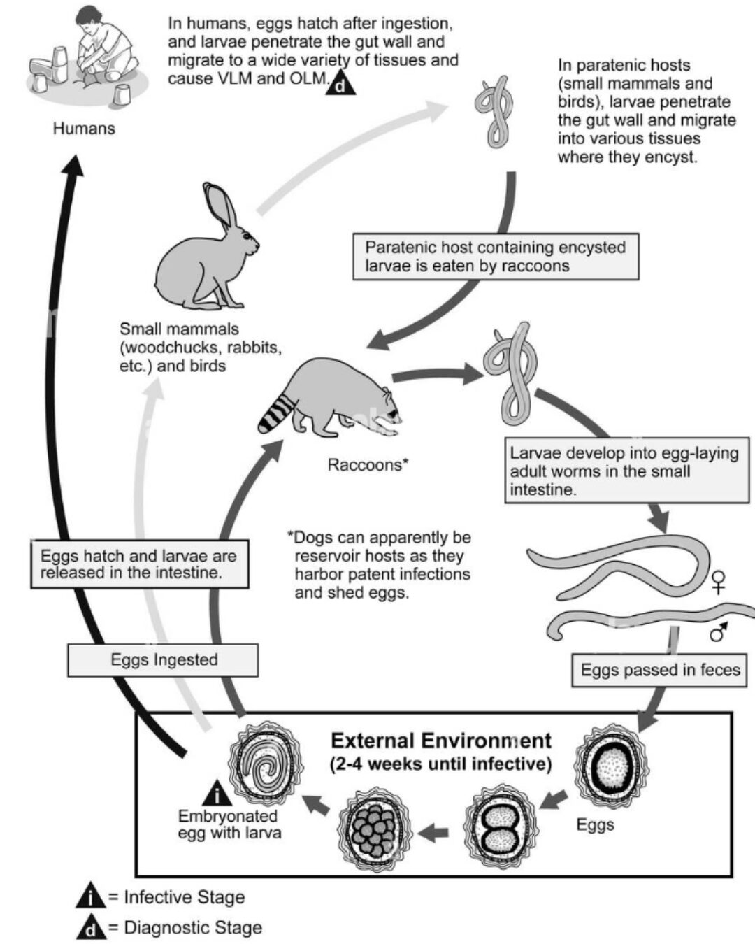 Although rare in humans, cases have been severe. A study in Clinical Microbiology Reviews found that among documented human cases, the majority resulted in severe neurological damage, with 64% severe neurologic sequelae and 28% resulting in death from neural larva migrans.