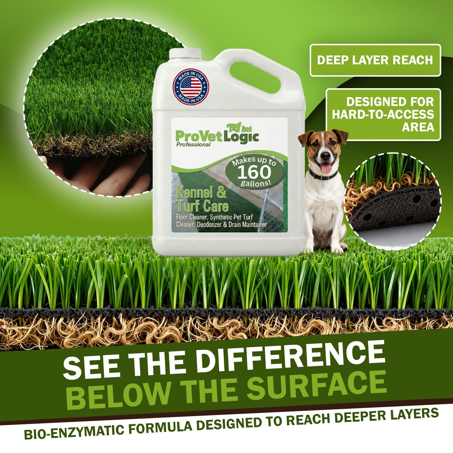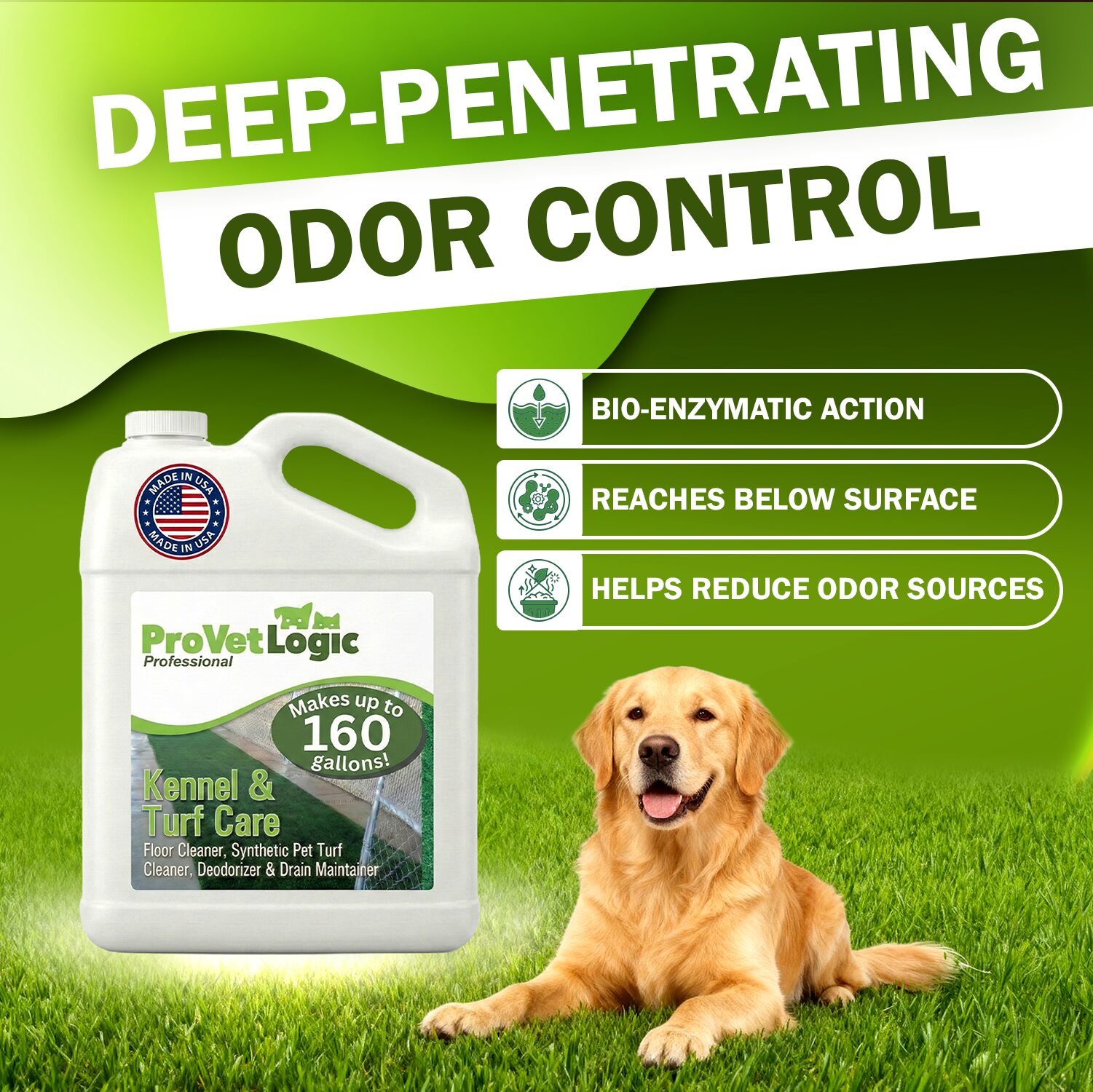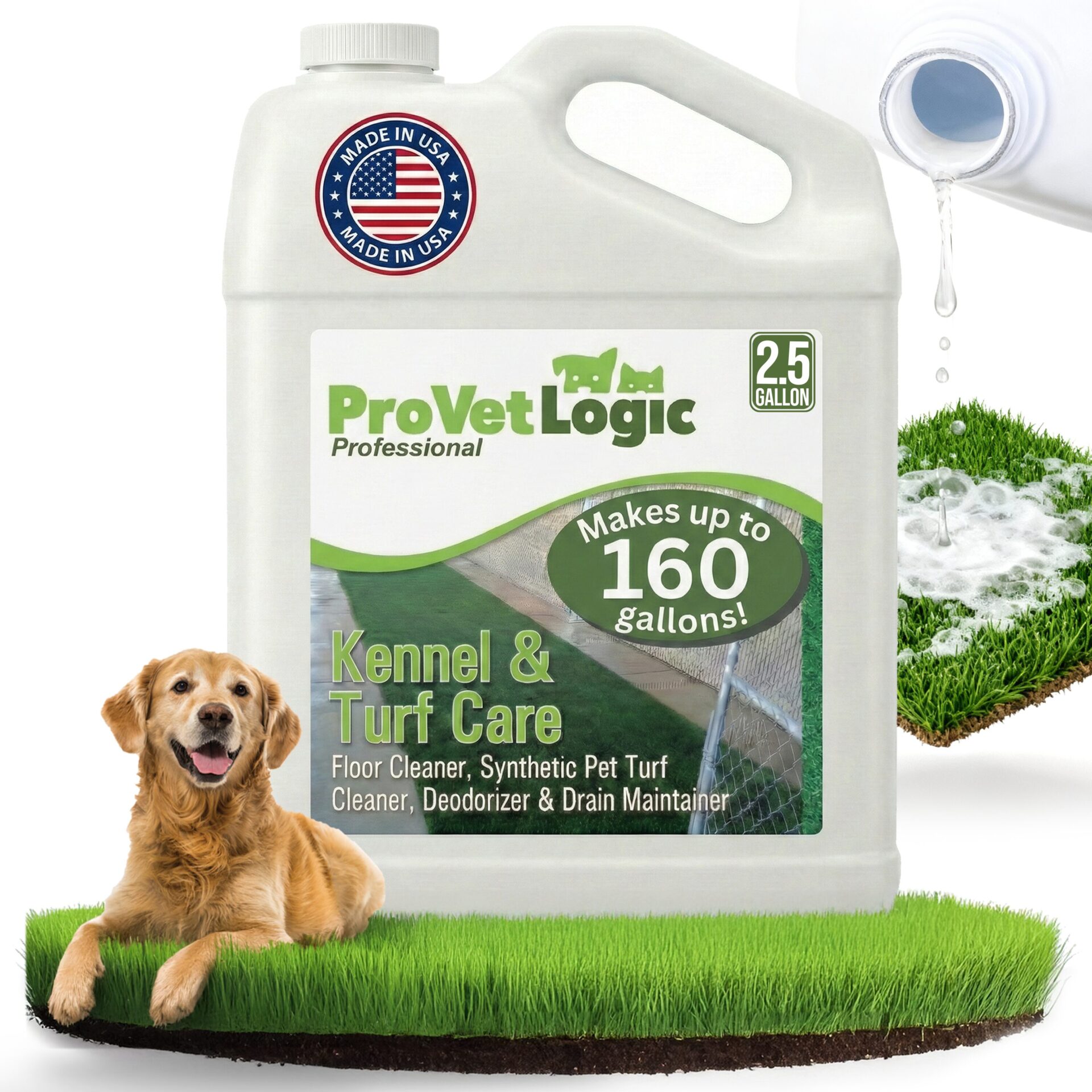 One 2.5 gallon bottle of Kennel and Turf Care Floor Cleaner, Deodorizer and Drain Maintainer uses patent-pending technology that effectively removes stains and soils from kennel floor and other porous surfaces.